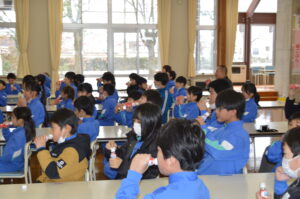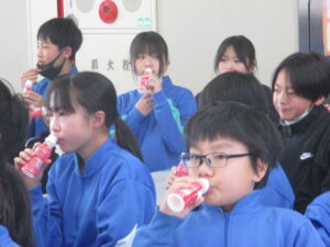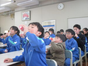 児童代表6年の上島さんが乳酸菌飲料提供へのお礼の言葉を述べ、同じく児童代表6年の大嶋さんが元気よく「いただきます」の号令をかけ、全員で乳酸菌飲料をいただきました。本日から3月4日(水)までの約2か月間にわたっていただきます。