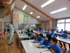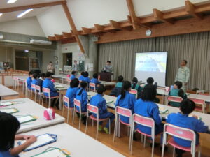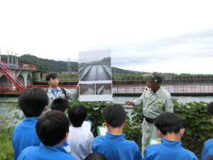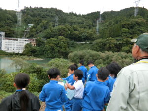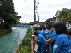 ひばり野小学校のランチルームで、黒東合口用水の概略の説明を受けた後、実際に「愛本堰堤」「墓ノ木分水工」「下山芸術の森発電所美術館」を見学し、用水の歴史や働き、水のゆくえ、生活とのつながり等について詳しく学ぶことができました。