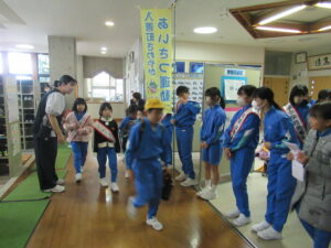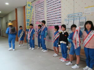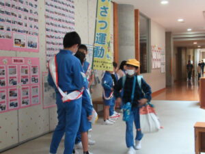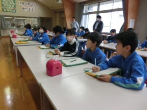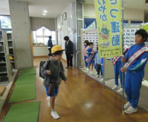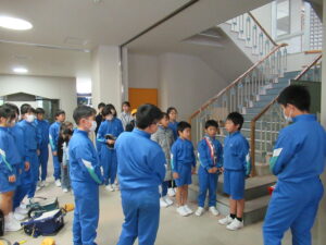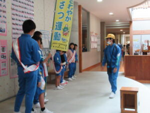 体育委員会が、大休憩に「なわとび集会」を開いてくれています。今日は、低学年の集会でした。体育委員会の5、6年生が、前とび・後ろとび・あやとびの3種目の手本を見せ、コツを教えてくれます。1、2年生は、それを見て「すごい!」「あんなに高くとんでいるんだ!」と目を輝かせていました。お手本を見た後は実際にやってみました。子供たちの中には、今までよりたくさん跳べるようになった人もいるようです。お兄さん、お姉さんから教わるのはとても効果的ですね。