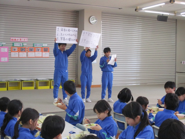 学校給食週間の活動の一つとして、6年生がこれまで給食を食べてきておいしかったメニューを参考に新しいメニューを考え、全児童に提案しました。全児童による投票の結果によって、2月22日(金)と6年生最後の給食のそれぞれに出されます。6年生は自分のグループで提案したメニューに投票してもらおうと、おいしさをアピールしたり、栄養をアピールしたりとあの手この手でプレゼンをしていました。さて、選ばれるのは2作品、どのメニューでしょうか。こうご期待。