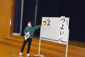 書き初め指導【4年生 12月9日】 今日は、4年生を対象に、兵庫先生をお招きし、書き初め教室を実施しました。書くときのポイントを一つ一つ丁寧に教えていただき、子供たちはそのポイントを意識しながら集中して書き初めに取り組んでいました。また、巡回しながら、手を取って一緒に書いてくださったり、分かりやすく助言してくださったりと、丁寧なご指導をいただきました。ありがとうございました。