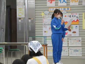 今日は、給食週間最終日の5日目です。大休憩には、各学年代表による豆つかみ大会がありました。また、給食中に、4、5、6年生の代表が、日頃お世話になっている調理師さんや給食を運搬してくださる方、事務官さん、校務助手さんに感謝の手紙を渡し、思いを伝えました。