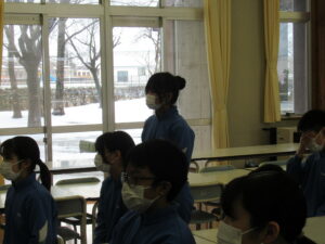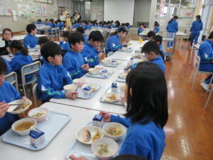今日の給食メニューは、町内の中学生が訪問している北海道の郷土料理で、「鮭のチャンチャン焼き」「いも団子汁」が登場しました。とてもおいしくいただきました。