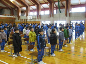 卒業式全体練習1回目・授賞式【全校 3月7日】 今日から全校での全体練習が始まりました。式での椅子の座り方や姿勢等の所作について練習した後、呼びかけや在校生の歌唱練習を行いました。各学級での事前練習もあり、1回目でしたが、なかなか上手でした。本番に100%の力が発揮できるよう頑張っていきましょう。 式練習の後、本年度最後となる授賞式が行われました。三行詩コンクールで佳作を受賞した野口さん、おめでとうございます。