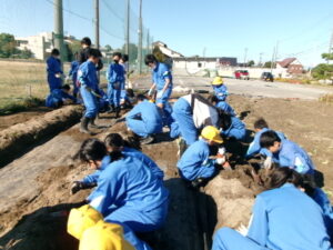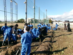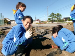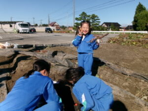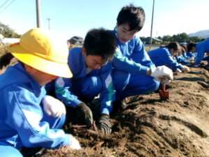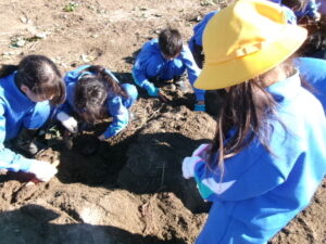 サツマイモ堀り【1・6年生 10月15日】 今日は1、6年生のペア学年でサツマイモ堀りを行いました。6年生が一足早く畑に行き、予めツルや雑草を取り除いてくれました。一緒にサツマイモを掘る姿はとても微笑ましく、6年生の立派な姿と、1年生の一生懸命な姿を見ることができました。