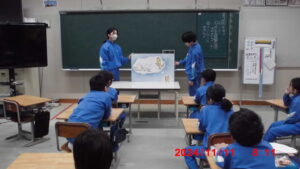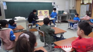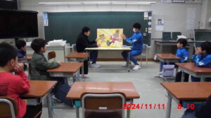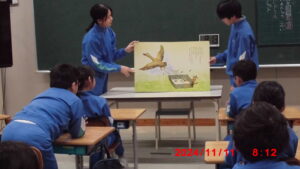 大型絵本読み聞かせ【図書委員会 11月11日】 今月の14日までの期間、図書委員会主催の「校内読書週間」が実施されています。期間中は、読書タイムや読書スタンプラリー、先生方のおすすめの本紹介等、様々な楽しいイベントが行われています。 今日の朝学習は、図書委員による低学年の大型絵本の読み聞かせがありました。舟根先生が、町の図書館から借りてこられたものです。普段なかなか見ることがない大型絵本に、身を乗り出して楽しそうに聞く1、2年生の姿が見られました。読書週間は、今週末までですが、この週間を機に、読書の楽しさを味わってほしいと思います。