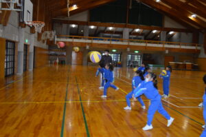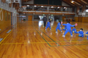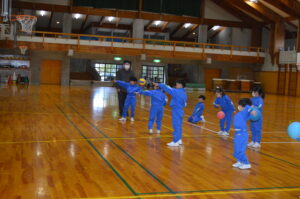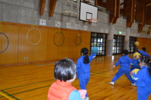 ボール投げゲーム【1年生 12月12日】 1年生の体育科の学習は「ボール投げゲーム」でした。自由に投げる活動の中で、子供たちは、「ボールが軽いと投げにくい」「投げやすい大きさがある」「投げる手と反対の足を前に出すと投げやすい」などと、たくさんのことに気付きました。話し合いで考えを交流し、今日は自分に合ったボールや的を選んで投げました。どうやったら的に当たるか、どの子も真剣な表情で取り組みました。