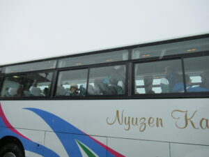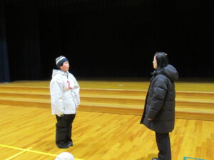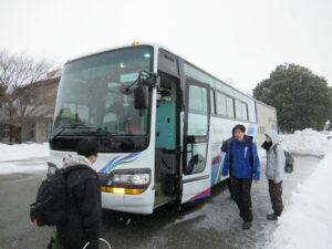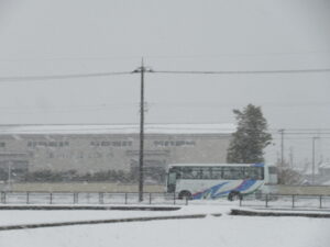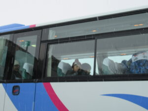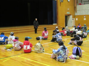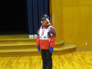 スキー学習会 出発式【5年生 1月28日】 ちらちらと雪が降る中、5年生がスキー学習会に出発しました。出発式では、大田さんが「一生懸命練習をして、うまく滑れるようになり、いい思い出にしたい」と児童代表の言葉を述べました。真っ白なゲレンデで、思いっきりスキーを楽しんできてほしいと思います。