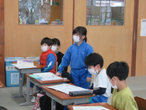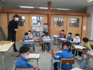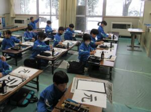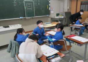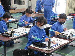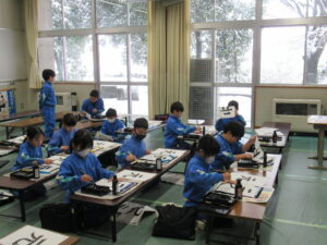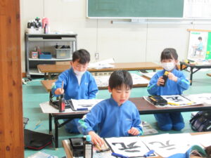 書写【3年生 1月29日】 3年生は、書写の時間に、「元」という字に取り組んでいました。毛筆は3年生から始まりますが、1年間で筆遣いがとても上手になり、今日の目当ての「おれ」「はらい」に気を付けながら、字形の整った勢いのある字を書いていました。