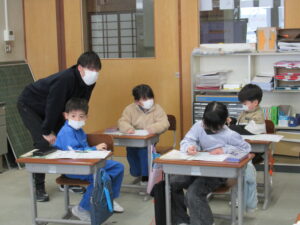 漢字の「おれ」「まがり」「そり」「かきじゅん」【1年生 1月29日】 1年生の4時間目は、岩山先生の書写の時間でした。今日は、漢字の「おれ」「まがり」「そり」「かきじゅん」に気を付けて、一画一画丁寧に書いていました。練習する中で、「上から下へ」「左から右へ」など、漢字の書き順のきまりに気付くこともできました。