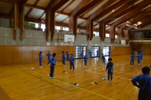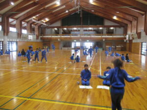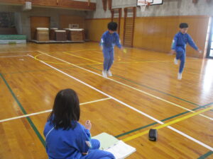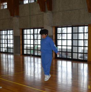 準備運動で体を温めた後、各学年で定められた3種類の「スピード跳び」に挑戦しました。ペア学年のグループ同士で数を数えたり、「頑張れ」「あと少し」と応援し合ったりして、会場は大いに盛り上がりました。