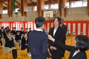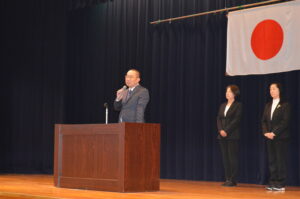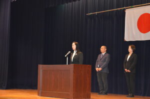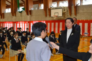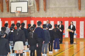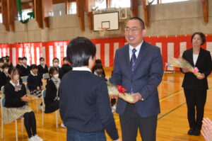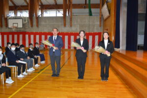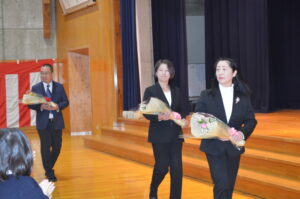 離任式【3月24日】 引き続き行われた離任式では、今回の人事異動で本校を去られることになった、森岡校長先生、西島主任、髙島先生の3名をお送りしました。 校長先生の毎朝の温かな出迎え、西島主任の学校を支える献身的な事務、そして体育主任としてグラウンドを駆け回った髙島先生。それぞれの先生方からいただいた最後のお言葉を胸に、別れを惜しみつつも、感謝の気持ちを込めて花束と拍手を贈りました。3名の先生方の、新天地でのさらなるご活躍を職員・児童一同、心よりお祈りしております。