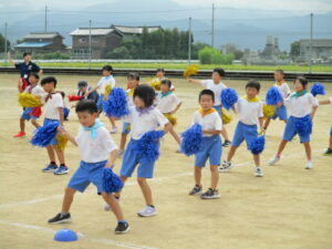 リズムダンス練習【1~3年生 9月18日】 1~3年生は、2時間目、リズムダンスの練習でした。9月から練習を始め、暑い中、これまで頑張って練習をしてきました。今日の練習を見ていると、笛の合図ですばやく隊形移動ができ、ダンスも、曲に乗って切れのある動きになり、笑顔も見られるようになりました。よい仕上がりです。