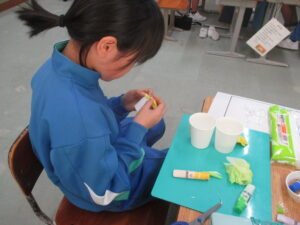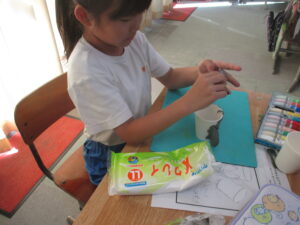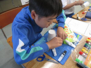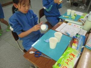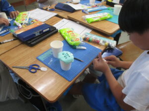紙ねん土でマイグッズ【3年生 10月15日】 3年生の図画工作科は「紙ねん土でマイグッズ」の学習をしています。紙コップ3つと紙粘土を使い、鉛筆やふせん等の散らかりやすいものを収納できるマイグッズをつくっています。子供たちは、友達の作品を見ながら、自分のイメージに近付けていました。完成したものに、マイグッズを入れるのが楽しみです。