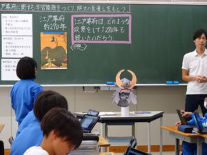 研究授業【6年生 10月17日】 6年生では、社会科「江戸幕府と政治の安定」の学習を行いました。鎌倉、室町幕府と江戸幕府の期間を比較することで、子供たちは「江戸幕府は、どのような政策をして、約270年間も続いたのだろう」という学習問題をつくりました。この問題を解決するために、子供たちは、徳川家の立場に立ち、先の幕府が崩壊した原因や信長、秀吉の働きを基にして、独自の政策を考えました。友達との対話を通して、よりよい仮説や解決の方法を明確にし、楽しみながら学習に取り組みことができました。 KODAK Digital Still Camera