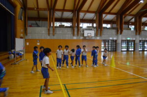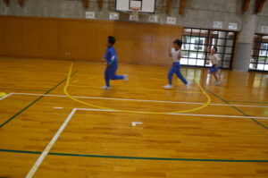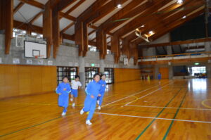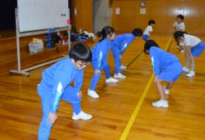 2年生は、あいにくの雨のため、体育館で練習しました。体育係の号令で準備運動をし、400メートル走の大体のタイムである2分間を走りました。回を重ねるごとに、スピードが増してきました。また、走り続ける距離が長くなってきました。