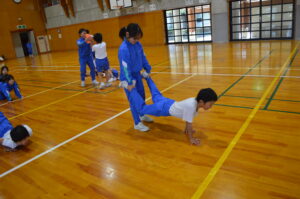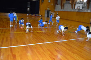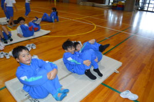持久走練習の次に、マット遊びをしました。犬やクモ、ウサギなどの歩き方で、しっかり手をついて体を支えることや、ゆりかごをして背中を丸めて回る感覚を養っています。今後は、いろいろな回り方に挑戦します。