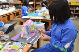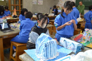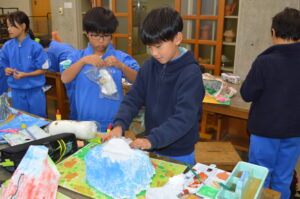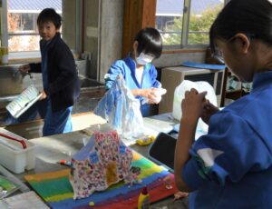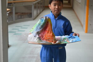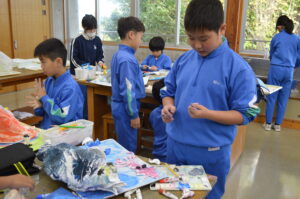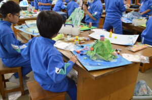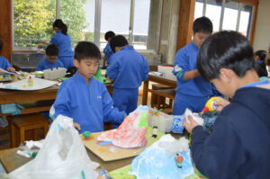 ころころカッチン【4年生 11月5日】 4年生は図画工作科で「ころころカッチン」を製作しています。空き缶等をナイロン袋に入れた型に布をかぶせ、そこに液体粘土を塗り、固めました。 自分のつくりたいもののイメージを膨らませながら、着色したり、粘土で動物や生き物、小物等をつくったりして、思い思いの作品に仕上げ、出来上がった作品を誇らしげに見せていました。