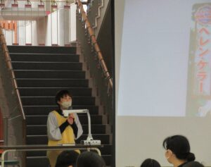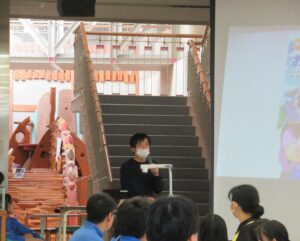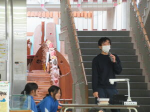 先生方のおすすめの本は?【図書委員会 11月6日】 給食時に、ランチルームで、図書委員会主催の「先生のおすすめの本紹介」がありました。今回は、上田先生と横田先生が自分のおすすめの本や本が好きになったきっかけ等を話され、子供たちは興味津々で聞いていました。給食が終わってから、早速、紹介された本を手にする子供たちの姿が見られ、本好きになるきっかけになりそうです。