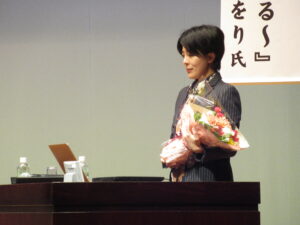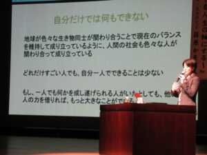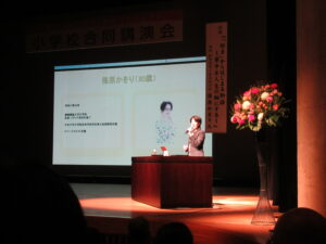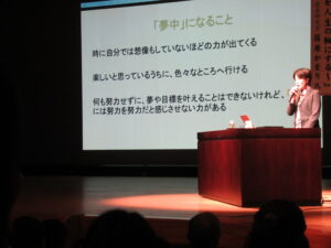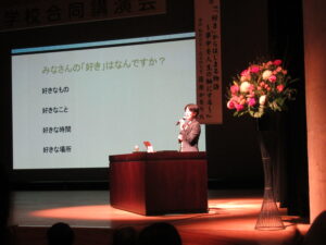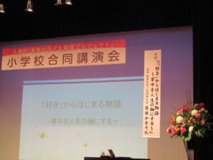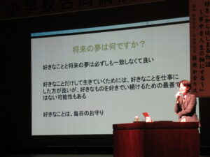 『「好き」からはじまる物語~夢中を人生の軸にする~』という子供たちの未来につながる素敵な演題でお話をされました。前半では、現在に至るまでの篠原様の人生を、映像を交えながら聞かせていただきました。後半では、篠原様から子供たちに、夢や未来につながる素敵なメッセージが贈られました。「好きなもの、夢中になれることにたくさん出会って、楽しい人生を送ってください」「一つでも夢中になれるものがあれば、世界はずっと面白い」という言葉が、特に心に残っています。