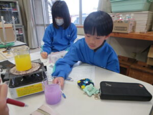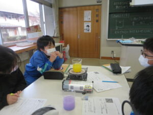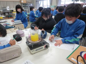 4年生の理科では「物のあたたまり方」の学習をしています。これまでに、金属や空気のあたたまり方について、実験を通して学習しています。今日は、「水はどのようにあたたまるのか」、各自が予想を立て、実験しました。