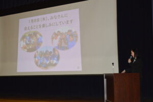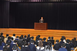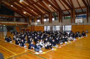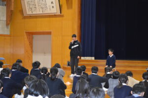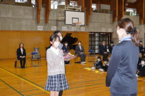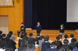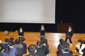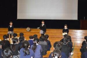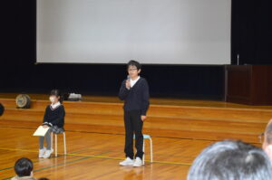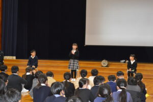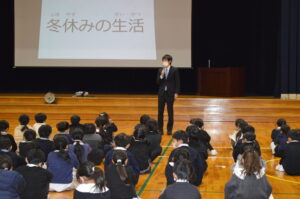 式の後、各学年代表が、2学期の思い出を全校の前で堂々と発表しました。それぞれの思い出やそこから得た学びや成長を、自分の言葉でしっかり全校に伝える姿を見て、とても嬉しく思いました。また、生徒指導主事の横田先生から、安全で楽しい冬休みの過ごし方についてお話があり、子供たちはしっかりと目と心で聞いていました。