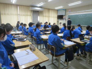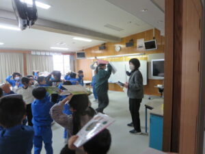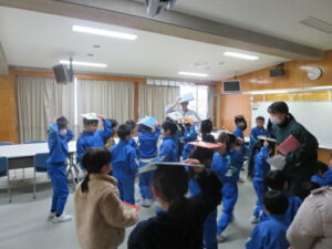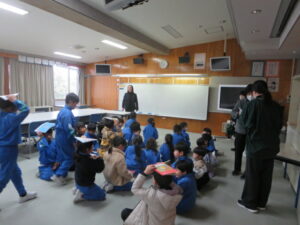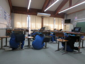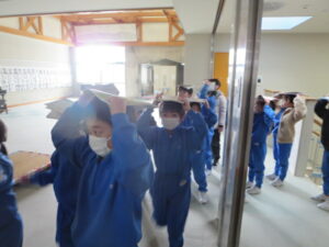 2時間目に、地震・津波対応の避難訓練を実施しました。訓練では、震度6強の強い地震が発生し、直後に津波警報が発令されたという想定で実施しました。校内放送の指示に従って、机の下に入り、身を守った後、1、2年生は「お(おさない)・は(はしらない)・し(しゃべらない)・も(もどらない)」のきまりを守って、頭部を守りながら2階の視聴覚室に避難しました。3~6年生は、各教室で静かに待機しました。どの学年も真剣に取り組み、地震や津波の災害から身を守るための正しい行動をしっかり身に付けることができました。