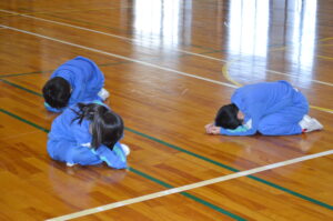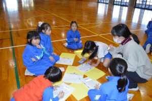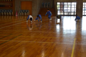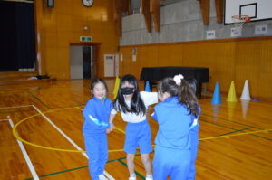 1年生の体育では、音楽に合わせて体を動かす「リズム遊び」の学習に取り組んでいます。今日はそのまとめとなる最終回で、グループ活動に挑戦しました。「なりきる生き物」を決め、どんな動きにするかを自分たちで考えました。意見が分かれる場面もありましたが、相手の考えを聞き、折り合いをつけながら一つの動きをつくっていく姿が見られました。1年生が自分たちで「合意形成」をしながら学習を進める姿に、この1年間の大きな成長を感じました。