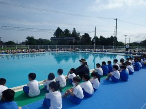 プール開き 先日、4~6年生がプール掃除をしました。そして昨日、きれいになったプールを囲み、プール開きをしました。校長先生から、水泳学習のめあて「命と健康」についてのはなしがありました。また、体育委員と「はとどけい」の約束を確認しました。安全に楽しく水泳学習に取り組んでほしいです。