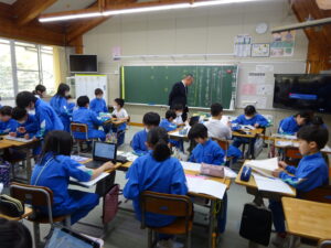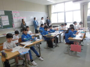 今日は、5年生がご指導を受けました。始筆や運筆等のポイントを分かりやすく、また、実技を交えて解説していただきました。子供からは、「この部分がうまくいかないので、教えてください」と質問が出るなど、真剣に取り組んだ1時間でした。