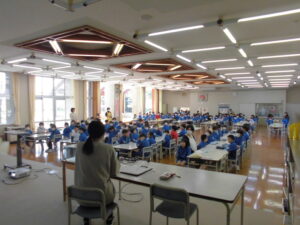 車椅子に乗って操作したり、パス、シュート、ゲームをしたりしました。教室の終盤には、講師の先生お二人対子供10人のゲームをしました。子供たちは、講師の先生方の巧みな車椅子操作に驚きながらも、必死にボールを追いかけながら、楽しさを体感しているようでした。また、この体験を通して、車椅子を使っている人の大変さ、相手の立場に立って考えることの大切さを学ぶことができました。